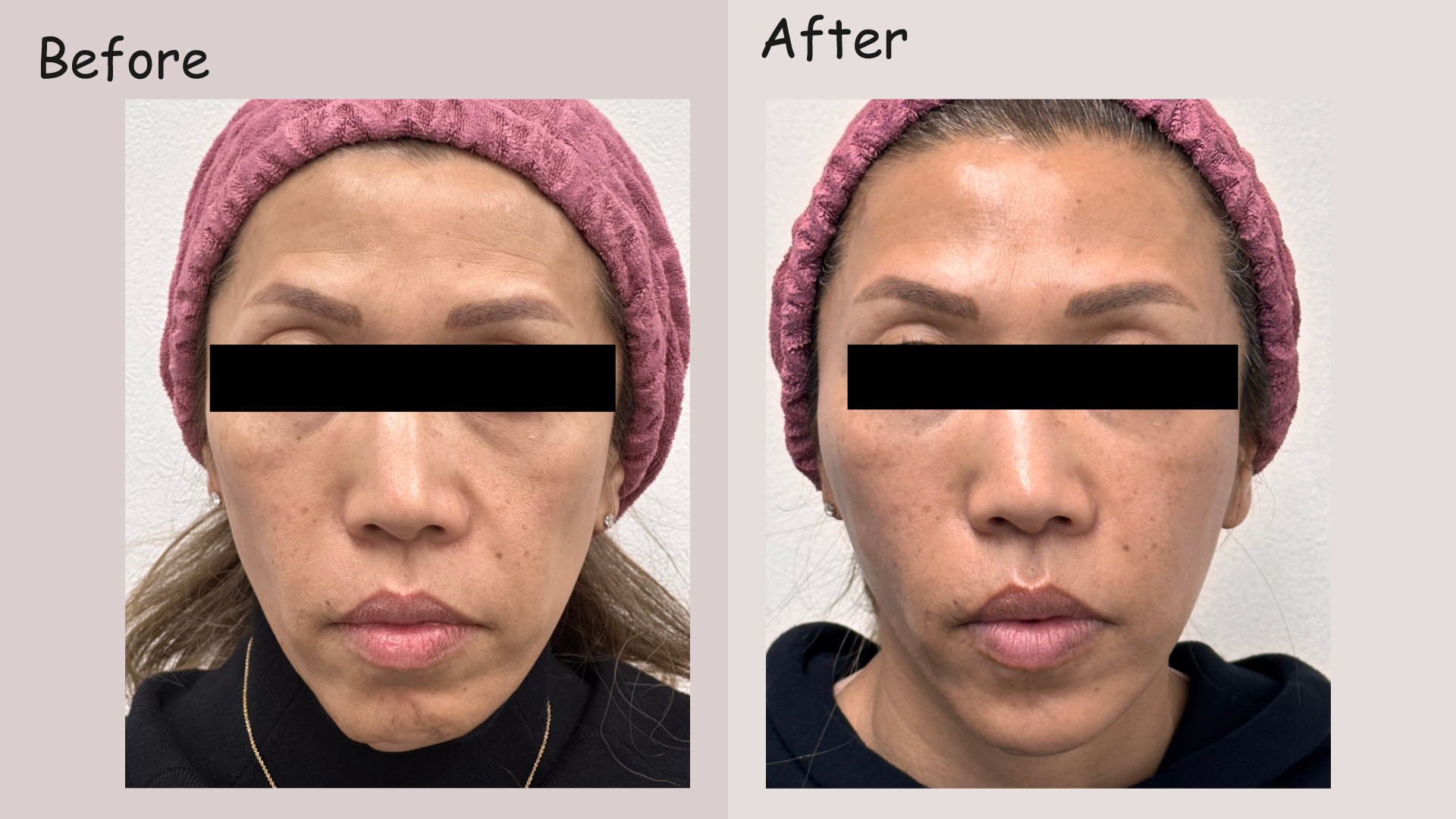 眉の位置が下がって額のシワが改善 頬の高さの左右差の改善 頬がふっくらとボリュームアップ 顎の歪みの改善 全体的に凹凸が減って滑らかなフェイスラインになり、優しく女性らしい印象になりました。