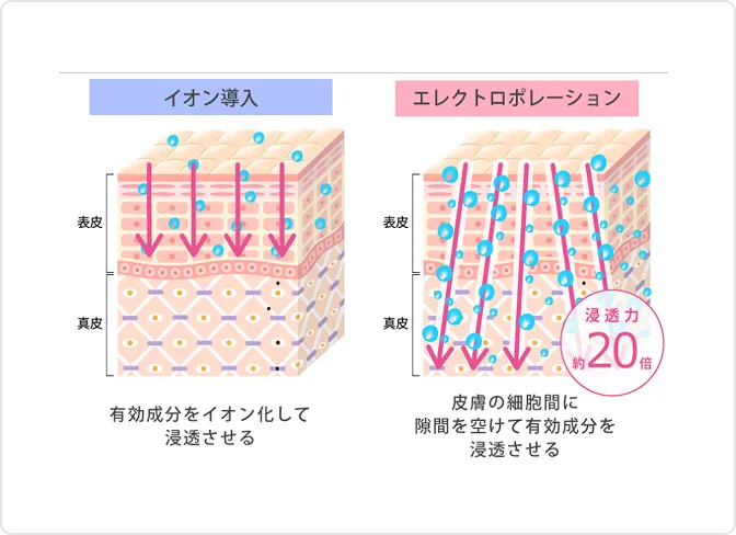 エレクトロポレーションは大きな粒子成分であってもお肌の深層に導入する事が可能です。それに比べ、イオン導入の場合は美容成分をイオン化してから肌に浸透させるため、導入できるのは粒子の小さい成分に限ります。